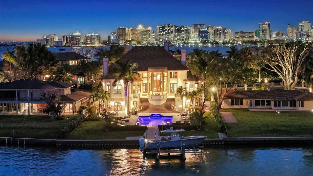 Introducing 'Gatsby Manor, set along Hillview Drive, one of Sarasota's most coveted bayfront addresses, often compared to Port Royal for its exclusivity and waterfront lifestyle, this rare Harbor Acres estate property spans nearly three-quarters of an acre on deep, boatable water with sweeping, unobstructed Sarasota Bay views stretching south toward Siesta Key and the Gulf of Mexico, representing one of the neighborhood's most distinguished open-bay offerings where only a select few residences a...Introducing 'Gatsby Manor, set along Hillview Drive, one of Sarasota's most coveted bayfront addresses, often compared to Port Royal for its exclusivity and waterfront lifestyle, this rare Harbor Acres estate property spans nearly three-quarters of an acre on deep, boatable water with sweeping, unobstructed Sarasota Bay views stretching south toward Siesta Key and the Gulf of Mexico, representing one of the neighborhood's most distinguished open-bay offerings where only a select few residences achieve true estate scale. Encompassing more than 8,000 square feet of air-conditioned space with four bedrooms and three-and-a-half baths. The residence is complemented by a grand motor court accommodating 15+ vehicles beneath a canopy of majestic grand oaks. Privately approached through wrought-iron gates and a sweeping circular drive anchored by a multi-tiered fountain, the home opens to a dramatic two-story foyer framing the water beyond. Interiors are defined by soaring ceilings up to 22 ft. in height, exceptional millwork, multiple fireplaces, a striking two-story wood-paneled library, formal dining with 12-foot ceilings, and a wetbar-perfectly blending elegant entertaining with comfortable daily living. The chef's kitchen is designed to support both everyday living and large-scale gatherings, featuring double 36-inch Sub-Zero refrigerators with dual freezer drawers, two dishwashers, and a 60-inch Wolf gas range with six burners and infrared dual griddle. The owner's suite occupies the entire east wing of the main living level, creating a private waterfront retreat complete with a gas fireplace, sitting area overlooking the pool and bay, dual walk-in closets, and a spa-inspired bath highlighted by a sculptural copper soaking tub, dual vanities, and a dedicated luxury makeup area. Upstairs, a second primary-style suite and two additional guest bedrooms are accessed via the grand staircase or three-stop elevator, offering privacy and flexibility for family and guests. The 3,800+ square-foot ground-level bonus area serves as the home's ultimate entertaining environment, featuring a remarkable speakeasy lounge and an impressive 700+ bottle wine room. This expansive space functions as a true extension of the residence's living experience-ideal for hosting gatherings, intimate evenings, or celebrations on a grand scale. Outdoor living is equally exceptional, centered around an expansive marble terrace surrounding the 25' ?? 60' heated saltwater pool with integrated sun shelf and spa. A brand new deep-water dock with a 20,000 lb. boat lift and seawall replaced in 2017 further enhance the property's boating capabilities and long-term value. Additional highlights include hurricane-rated garage doors, elevator access to all three levels, a drive-through three-car garage, and extensive storage throughout. Perfectly positioned just a short stroll to Southside Village's restaurants and boutiques, minutes from downtown Sarasota's celebrated arts and cultural district, and only four blocks from Sarasota Memorial Hospital. Gatsby Manor offers a truly rare opportunity to enjoy estate-scale open-bay living with deep water, privacy, and exceptional walkability in one of Sarasota's most prestigious waterfront neighborhoods.